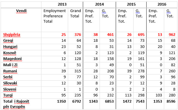 Tabela e emigrimit nëpërmjet programit të vizave për investime EB-5 për Shqipërinë, 2013-2016.