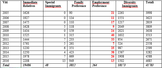 Tabela e vizave të emigrimit për SHBA, 2005-2016.