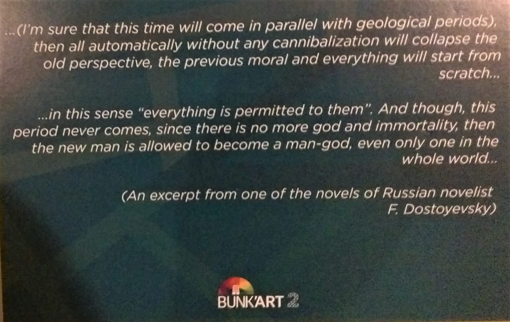 Ja dhe një citat i nxjerrë “from one of the novels of Russian novelist F. Dostoyevsky” (se cili është ky roman, vizitorit nuk i thuhet; mbase për të ruajtur sekretin), por i përkthyer nga ekspertët dadaistë të BUNK’ARTIT: