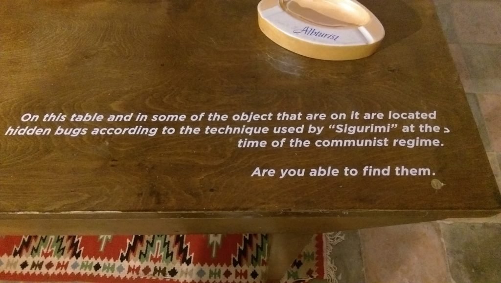 Arrijmë pastaj te një tryezë ku janë ekspozuar disa çimka dhe pajisje të tjera përgjuese që i përdorte Sigurimi për t’u informuar. Ja edhe përkthimi, pas gjase i bërë me Google Translate: