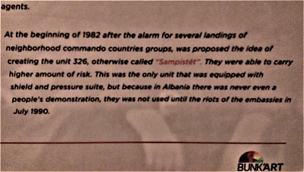 Ja një tekst informativ për të ashtuquajturit “sampistë”, që mund t’i kuriozonte vizitorët: në të shpjegohet se çfarë ndodhi në Shqipëri “after the alarm for several landings of neighborhood commando countries groups”: dhe pikërisht, krijimi i njësisë 326, të cilët “were able to carry higher amount of risk”, dhe e vetmja njësi që ish pajisur me “shield and pressure suite.” E megjithatë, sampistët nuk u përdorën, meqë “in Albania there was never even a people’s demonstration,” deri sa ndodhën “the riots of the embassies.”