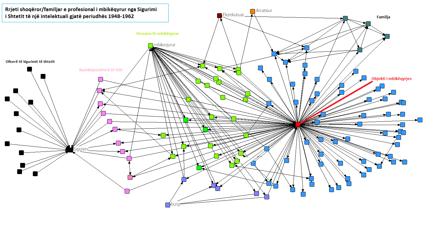 P.sh. nga analiza e rrjetit të mbikëqyrjes së një intelektuali shumë të njohur, del se bashkëpunëtorët e Sigurimit kishin në vëzhgim 10 lidhje nga rreth 200 lidhje direkte apo indirekte. Një pjesë e vëzhgimit realizohej nëpërmjet personave që ishin gjithësesi në mbikëqyrje nga Sigurimi. Më tej, Sigurimi kishte rrezik të “digjte” disa prej bashkëpunëtorëve të përfshirë në rrjetin e mbikëqyrjes, pasi i përdorte ata edhe për objekte të tjera vëzhgimi. Edhe pse Sigurimi kishte mundësi të kryq-ekzaminonte informacionin nëpërmjet raporteve nga personat e tjerë të mbikëqyrur, ky duhet të ketë qenë një proces i lodhshëm administrativ për vetë natyrën e organizimit kompartamental të shërbimeve (marrja e autorizimit apo kufizimet operative). Ilustrimi më poshtë tregon rrjetin e vëzhgimit të intelektualit, çfarë dëshmon edhe për rrezikshmërinë që paraqiste ky person për Sigurimin (shoqërohej me persona nën vëzhgim, kishte familjarë të ekzekutuar, të arratisur e miq në burg). Mbajtja e sekretit duket edhe problematike për faktin e përfshirjes së një numri të madh personash, p.sh. për rastin ishin përfshirë gjatë kësaj periudhe 12 oficerë të sigurimit dhe rreth 10-11 bashkëpunëtorë.