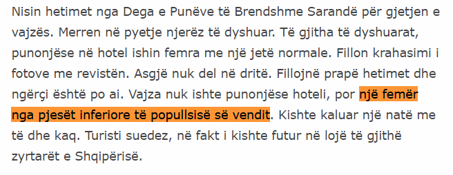 Këtu dyshoj se artikulli citon lirshëm nga ndonjë raport i Degës së Punëve të Brendshme, Sarandë; por autori, për të evituar ndonjë term të papërshtatshëm që ka gjetur atje (p.sh. jevgë ose cigane), ka shpikur – krejt pa dashur – një “pjesë inferiore të popullsisë të vendit”. Duke pasur parasysh se vetëm para pak ditësh u kremtua, madje edhe në Shqipëri, Dita Ndërkombëtare e Romëve, kjo akrobaci stilistike e artikullit më bën të mendoj se ne veç i kopjojmë nuk i adoptojmë institucionet dhe modelet e marrëdhënieve sociale; dhe respektin mosdiskriminues për pakicat e përkthejmë si gatishmëri për t’ua ndërruar emrat.