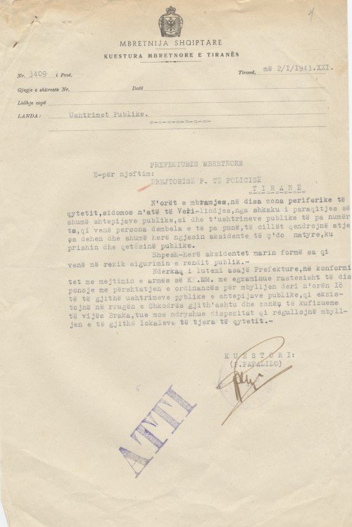 Në kontekstin e kësaj teme, një shok më dërgon imazhin e një dokumenti të vitit 1943, të lëshuar nga kuestori i Tiranës.