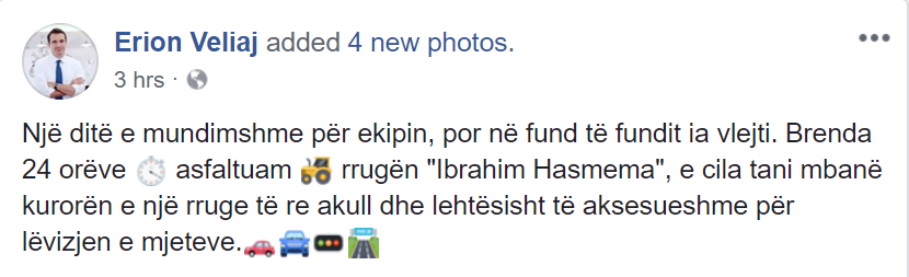 Te statusi origjinal, na dilte përpara emoji i një kronometri, që shoqëronte një kohëzgjatje (me gjasë, për të treguar se puna u krye shpejt, ose ishte me afat); më tej, emoji i një traktori, që shoqëron foljen “asfaltuam” për të treguar, gjithnjë me gjasë, se për asfaltimin u përdorën mjete të mekanizuara; dhe në fund, siç është zakoni, emoji të një veture, një kamioni, një semafori dhe një autostrade.