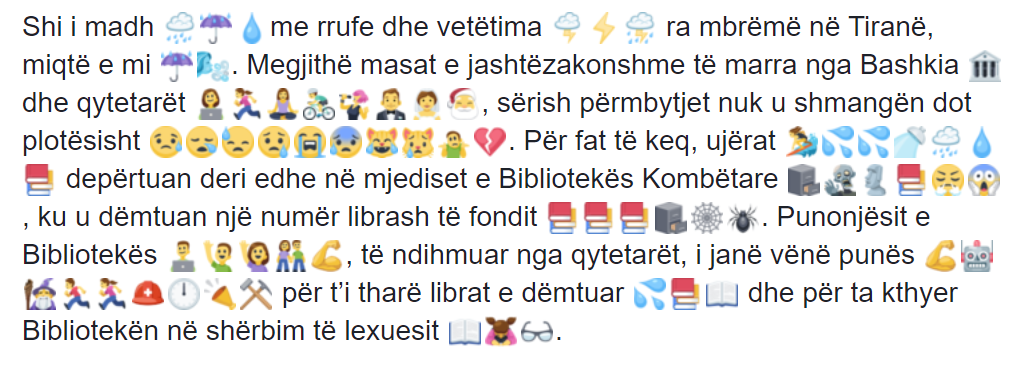 E kemi ndërtuar këtë tekst duke përdorur të njëjtat emoji që gjenden rregullisht te statuset e Veliajt, por këtë herë i kemi vënë në shërbim të një teksti tjetërlloj – që informon për një situatë emocionalisht negative, e cila shkakton shqetësim të madh shpirtëror dhe kulturor, si te Kryebashkiaku e stafi i tij, ashtu edhe te qytetarët. E kotë të shtojmë një ky lloj teksti nuk mund të funksiononjë dhe vështirë se do të shohim ndonjëherë statuse të ngjashme me këtë sipër, në komunikimin publik të Erion Veliajt.