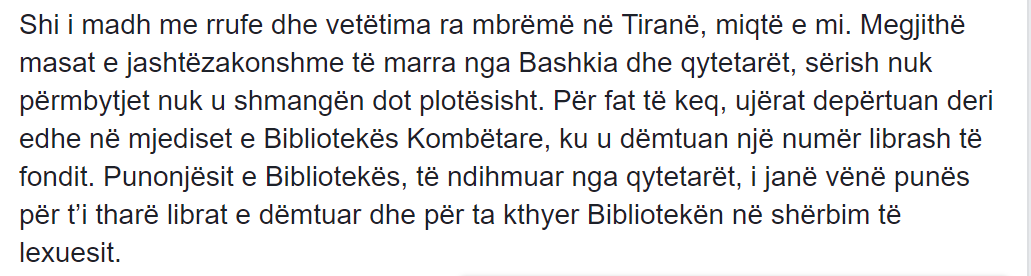 Për ta ilustruar këtë tezë – se statuset e kryebashkiakut Veliaj në Facebook i përkasin ligjërimit promocional tregtar (advertorial), po përdor një ngjarje të para pak ditëve në Tiranë: përmbytjen e Bibliotekës Kombëtare dhe dëmtimin e librave, gjatë një stuhie të pazakonshme që goditi kryeqytetin.