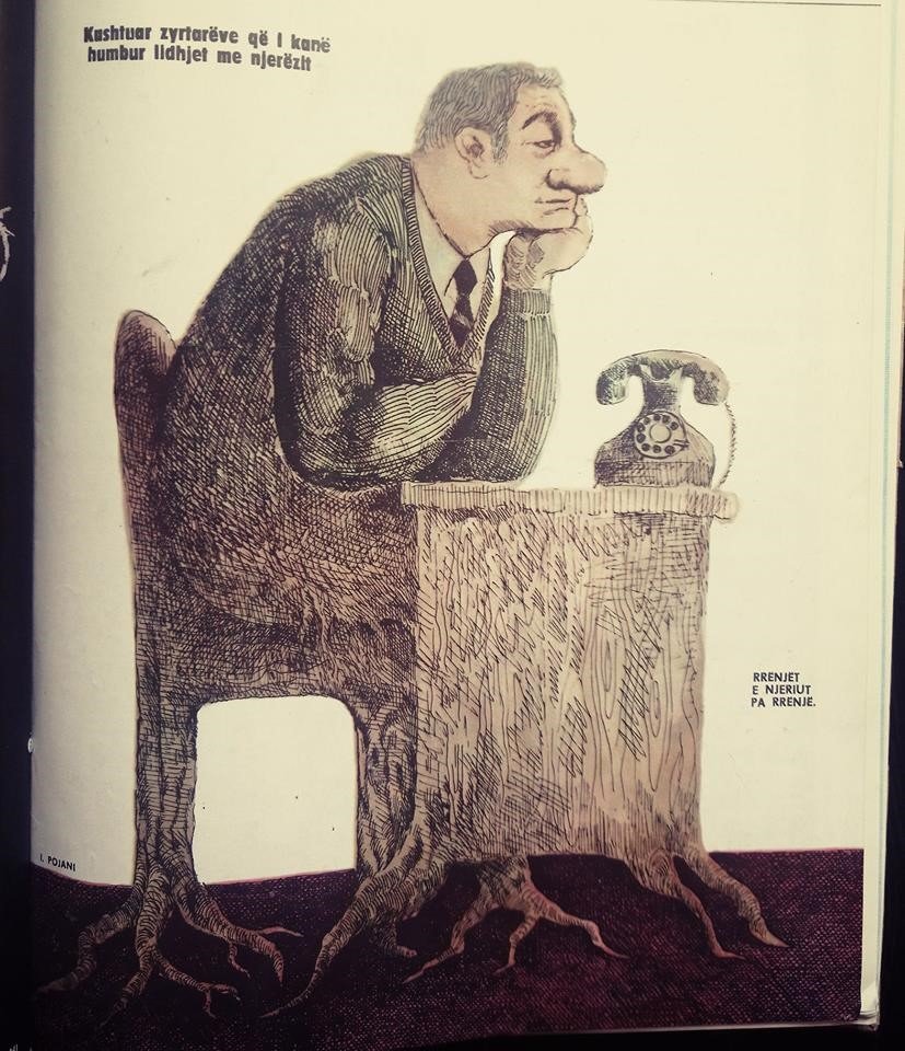 (Ilustrim nga Ilir Pojani kushtuar zyrtarëve që i kanë humbur lidhjet me njerëzit. Marr nga kopertina e revistës Hosteni, botimi 12 shkurt, 1985.)