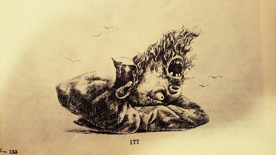 (Shkëputur nga ilustrimi me stilolaps i tregimeve të vëllezërve Grimm nga Maurice Sendak. Tregimi “Goblinët”. Botuar në 1973 në New York nga Farrar, Straus and Giroux.)