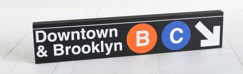 Më tregon se duke zbritur shkallët djathtas (sipas drejtimit të shigjetës të kthyer nga poshtë) do të arrij në platformën që u shërben linjave B dhe C, në drejtimin Downtown & Brooklyn (drejtimi i kundërt do të ishte Uptown & Manhattan). Ngjyrat – portokalli për B-në dhe blu për C-në nuk sjellin këtu ndonjë informacion esencial, por shërbejnë si kontekst dhe orientojnë në sfond (kodi i ngjyrave shërben për identifikimin e llojeve të linjave); sikurse më tregon, teorikisht, se drejtimi i treguar nga shigjeta nuk do të më çojë te asnjë nga linjat e tjera të metrosë së NYC, veç atyre të dyjave.