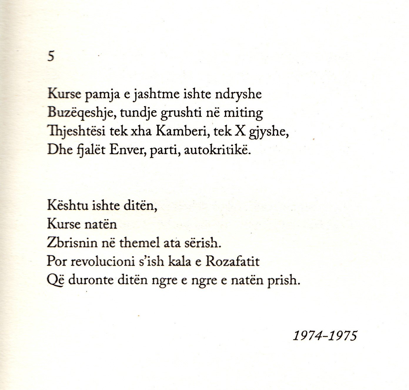 Ka edhe më. Në qoftë se kjo poemë, në botimin e saj “përfundimtar”, rimerret – të themi – në tekstet e historisë së letërsisë për shkollat, atëherë e drejta legjitime e autorit të saj për të bërë ndryshime në vepër shndërrohet në shkas për riparaqitje të historisë – sa kohë që versioni i tanishëm, i shkurtuar nga vetë autori, futet në një kontekst të viteve 1970, ku në fakt nuk ka ekzistuar kurrë në atë formë (poema është datuar në libër si 1974-1975, pa çka se është retushuar thellë shumë më pas). Edhe pse në shënimin e cituar më lart theksohet se “mendimi… që nuk ia njeh moralisht autorit këtë të drejtë, është konsideruar si një triumf i vonuar i diktaturës, e cila, edhe duke qenë e përmbysur, dikton ende kërkesat e saj mbi ato të artit”, unë do të shtoja se po aq triumf i vonuar i diktaturës do të ishte edhe ky efekt i modifikimit a posteriori të së shkuarës; ose censura e vonuar nga ana e autorit a e kujtdo tjetër.