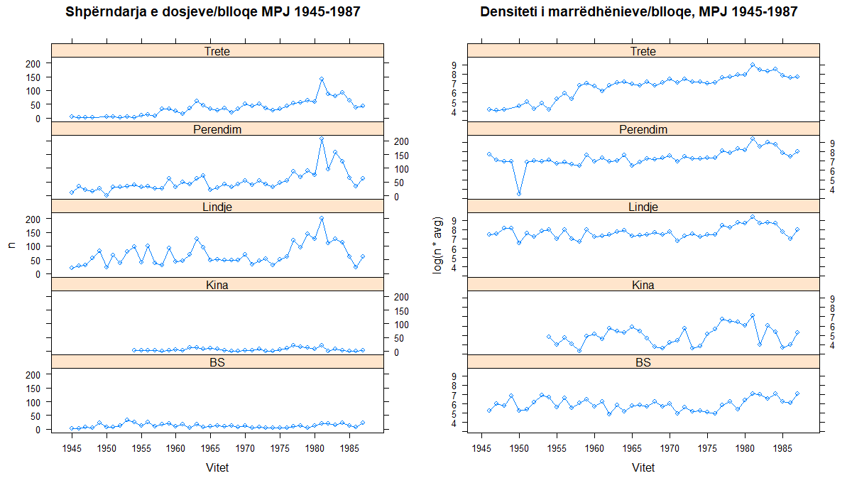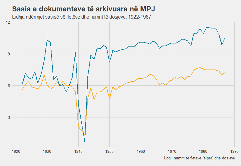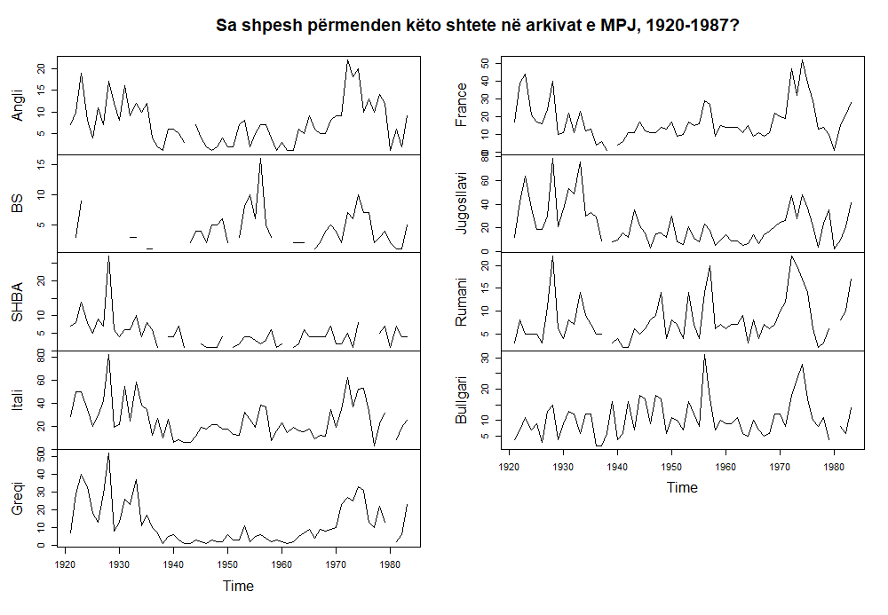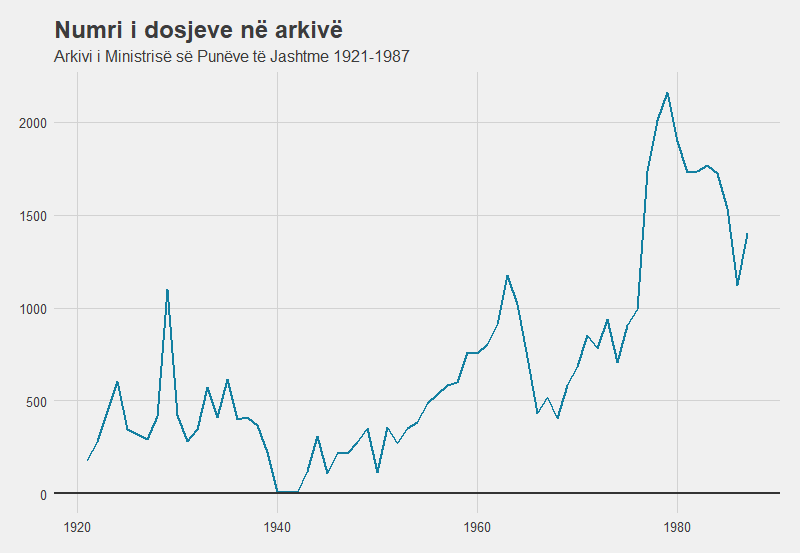Për të verifikuar këtë tezë të E. Mëhillit unë shkarkova dhe përpunova për vizualizim inventarin e dosjeve të Ministrisë së Punëve të Jashtme të publikuara në formatin PDF. Kurse përpunimi i inventarit të Arkivit Qendror kërkon shumë punë pasi është publikuar në një lloj database të vjetër (ASPX, Active Server Page Extended File). Me një program lexues OCR dhe PDF (OMNIPAGE), programet statistikore (R) dhe Excel/Microsoft i pastrova dhe ndërtova një dataset për periudhën 1922-1987. (Mungon viti 1941, viti 1944 është i ndarë në dy periudha dhe viti 1981 ishte i skanuar e mund të ketë gabime, ndërsa disa dosje nuk kanë numra).
