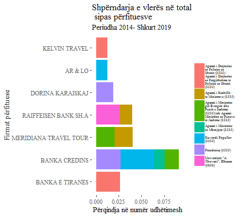 Rreth 10 firma kanë qenë përfituesit kryesorë të fondeve të shtetit, me rreth 80% të të gjitha shpenzimeve për udhëtime. Më poshtë përfituesit e preferuar sipas institucioneve buxhetore.