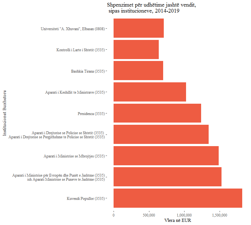 Nga rreth 25 milion EUR që janë shpenzuar për udhëtime jashtë vendit prej 2014, vlerën dhe numrin më të madh të udhëtimeve e kanë Kuvendi Popullor (mbi 1.5 milion EUR) dhe Ministria e Jashtme. Bashkia e Tiranës (afërsisht 700 mijë EUR, me shpenzime të mëdha që fillojnë në periudhën 2016-2018) dhe Universiteti i Elbasanit ua kalojnë edhe institucioneve qendrore. Një pjesë e këtij buxheti mund të jenë edhe nga projektet ndërkombëtare, financimi i të cilave kryhet nëpërmjet derdhjeve në llogarinë e Thesarit të Shtetit. Rreth 44% të vlerës totale e kanë shpenzuar institucionet e paraqitura në grafikun e mëposhtëm.