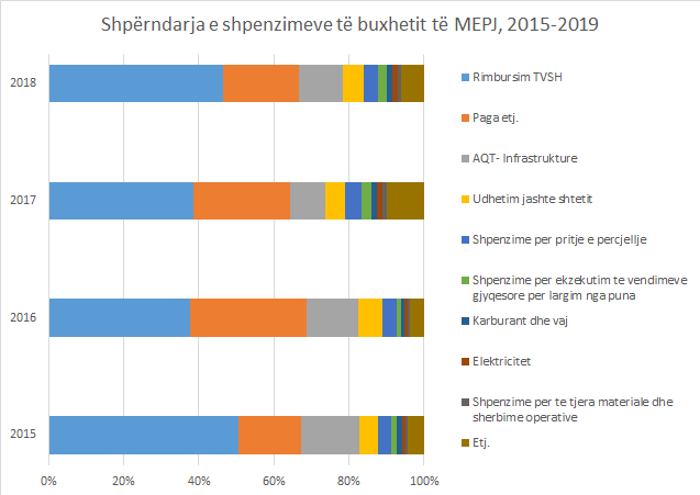 Rreth 38-50% e shpenzimeve të MEPJ-së shkojnë për rimbursime të TVSH. Pra buxheti faktik i MEPJ është rreth 3 milion EUR. Një pjesë, nga 16% deri në 25%, sipas vitit, shkojnë për paga, dieta e të tjera shpenzime për personelin. Shuma të konsiderueshme shkojnë edhe për pritje të delegacioneve, disa prej të cilave kushtojnë mbi 50 mijë EUR.