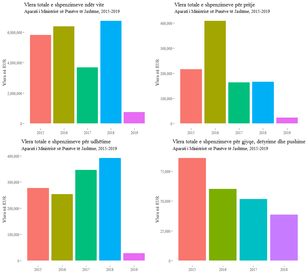 Për të kuptuar diçka mbi praktikat e shpenzimeve të buxhetit të shtetit në lidhje me udhëtimet jashtë vendit, unë analizova të dhënat e publikuara nga OpenData.al (http://spending.data.al/en/treasury/list/year/2015). Këtu paraqiten disa nga përfundimet e mia mbi shpenzimet e MEPJ dhe të institucioneve të tjera për udhëtimet jashtë vendit (të dhënat për përpunim të mëtejshëm i gjeni këtu). Analiza bazohet mbi rreth 13.6 mijë transaksione në total dhe afro 3.6 mijë transaksione të MEPJ.