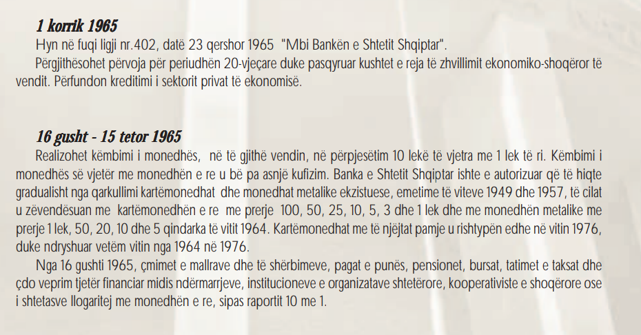 Por vetëm një paragraf më lart, që i referohet datës 1 korrik 1965, lexoj se me ligjin nr. 402, datë 23 qershor 1965, “Mbi Bankën e Shtetit Shqiptar”… Përfundon kreditimi i sektorit privat të ekonomisë.