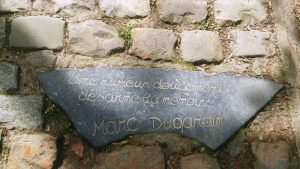 Një pllakë më lart shkruhej: Dans l’haleine des nuits/l’âme continue de veiller. (Në frymën e natës/ shpirti vazhdon të përgjojë. Ishin vargje që i përkisnin A. Ayguesparse.