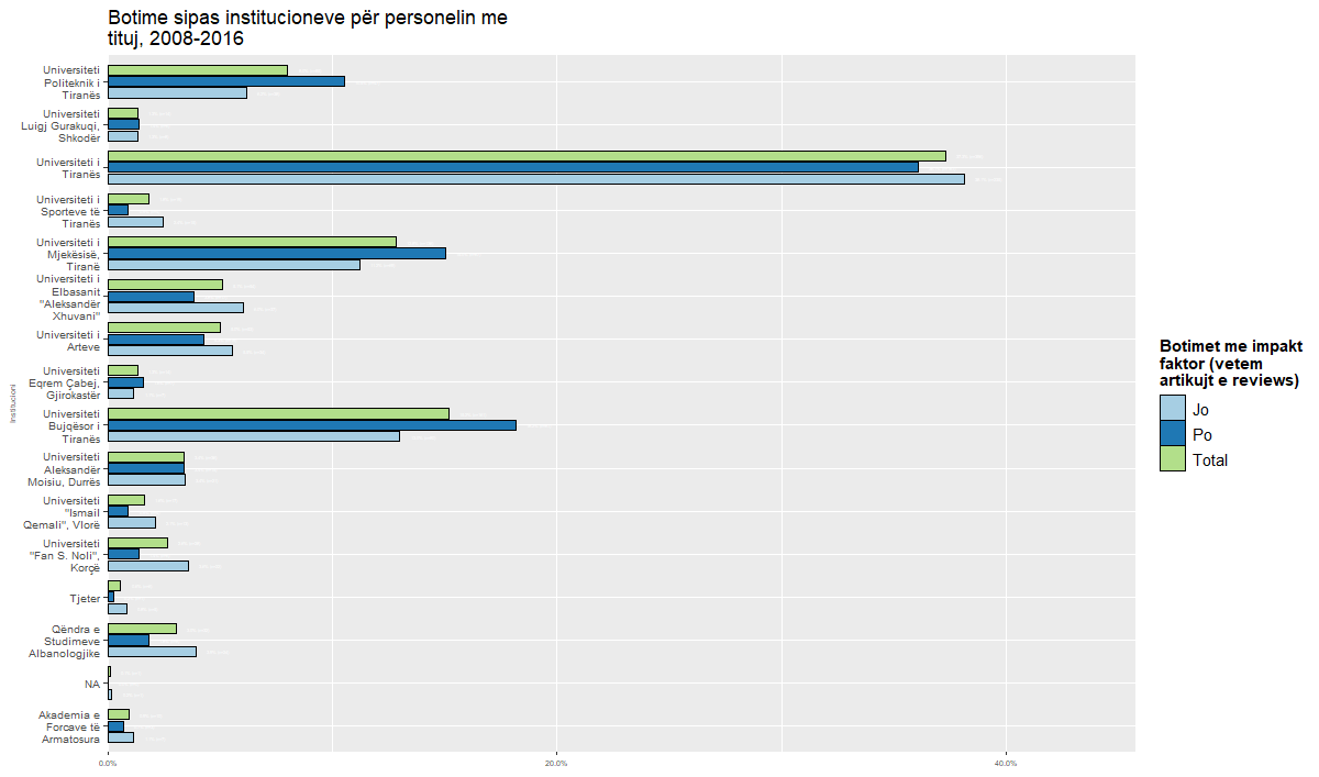 Sikur e kemi diskutuar në një studim të mëparshëm bibliometrik, situata është jo premtuese, sidomos kur vërehet në krahasim me vendet e tjera të rajonit, Shqipëria qëndron shumë larg Serbisë, e madje pas Maqedonisë. Universiteti i Tiranës ka rekordin më të mirë për publikimet në Shqipëri, e më pas vijnë Universiteti i Mjekësisë. Nga privatet udhëheq Epoka. Më poshtë paraqiten grafikë në lidhje me indeksin Web of Science (Impact Factor), ku janë përfshirë të gjitha produktet (edhe konferencat apo datasets etj.).