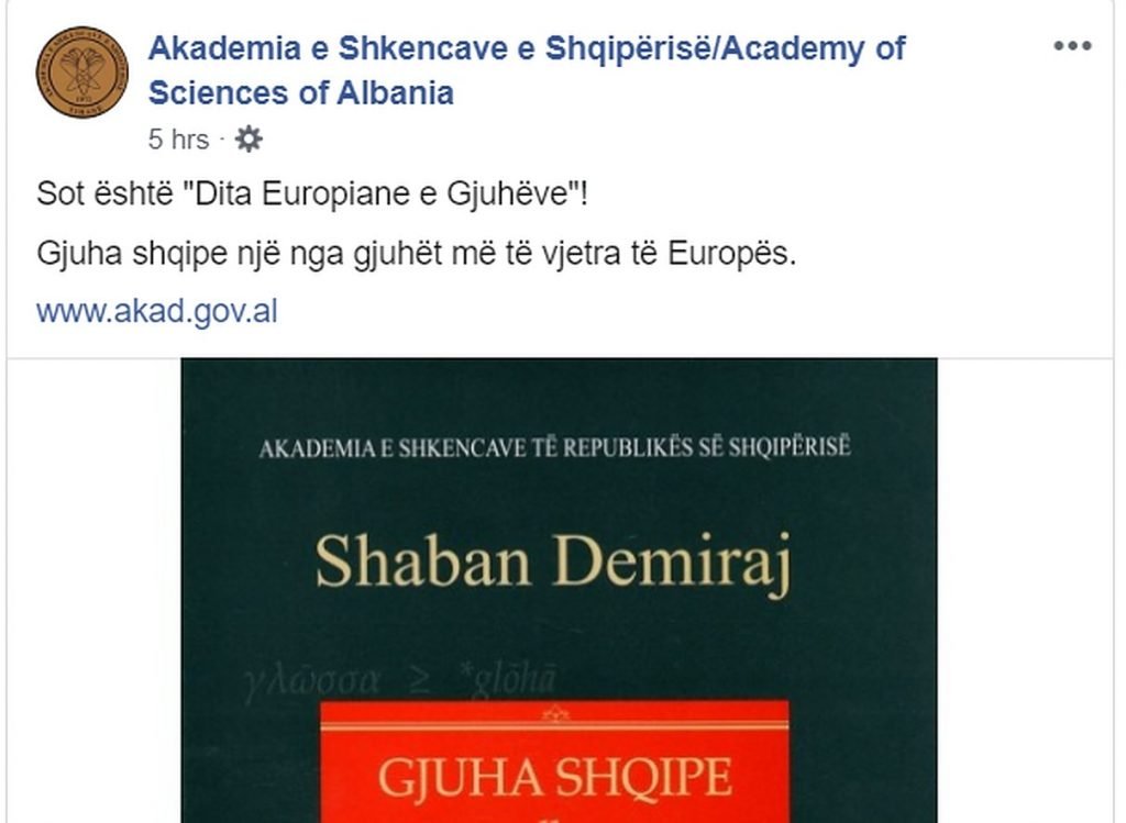 Akademia e Shkencave e Shqipërisë kish zgjedhur ta kremtonte “Ditën Europiane të Gjuhëve”, në Facebook, me kopertinën e librit të Shaban Demirajt, Gjuha shqipe dhe historia e saj, të ilustruar me parullën “Gjuha shqipe një nga gjuhët më të vjetra të Europës.”