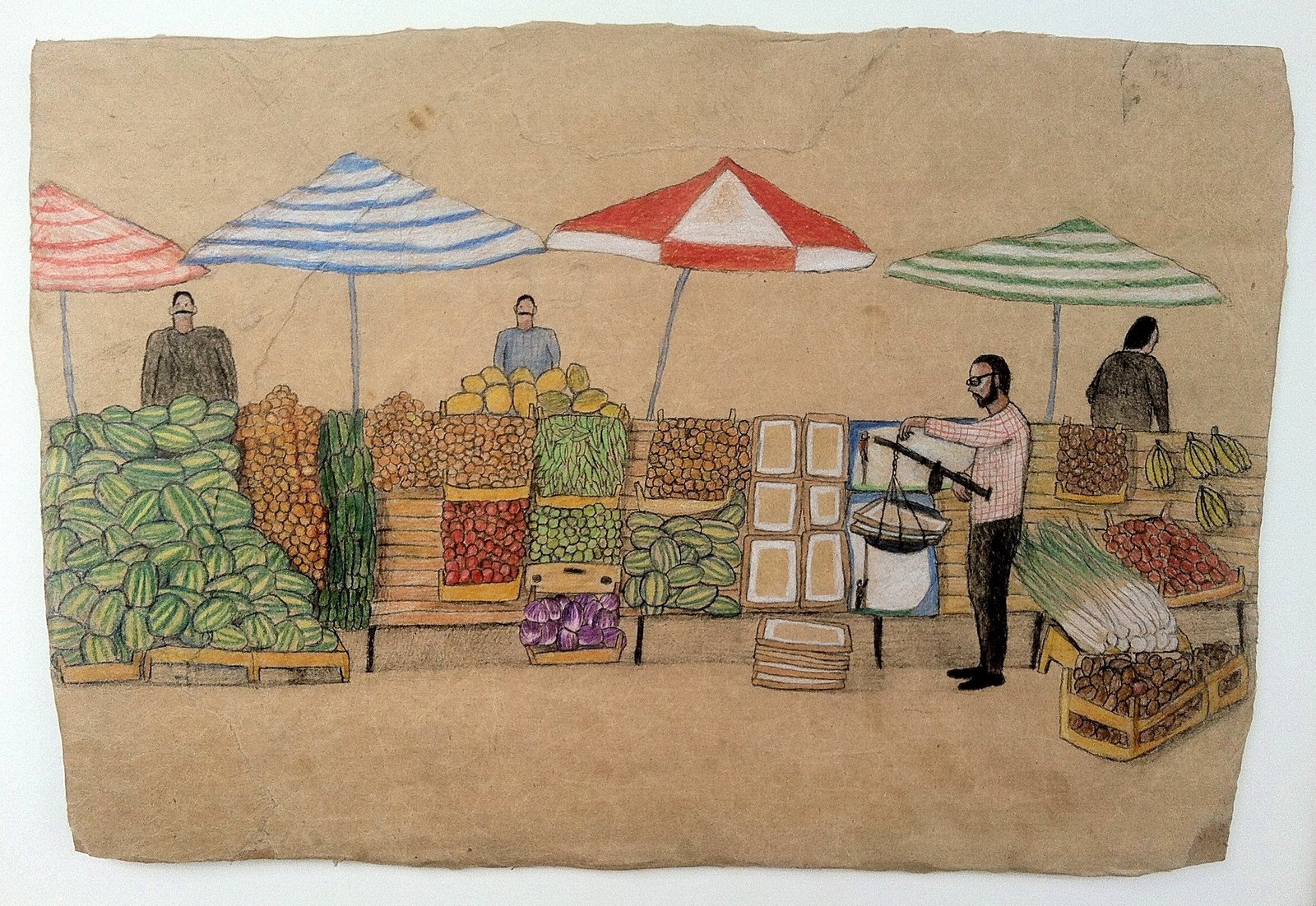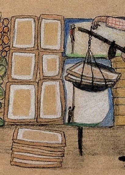 Në mes të një tregu zarzavatesh e frutash, shohim edhe vetë piktorin e këtij punimi duke peshuar veprat e artit. Ai duket i zhytur tërësisht në botën e tregut dhe përllogaritjes: sa duhet ta shesë kilen e artit të tij? Si do konkurrojë me shitësin e shalqinjve? Si do t’i bëjë veprat e tij më joshëse për blerësin se sa shitësi i preshve? Çfarë teknikash do përdorë për ta bërë blerësin për vete? Ai nuk shfaqet si zakonisht: një piktor i përqendruar në përballjen me veprën e tij apo duke ju shpjeguar veprën e tij të tjerëve. Jo, aspak. Ai sytë i ka të drejtuar vetëm tek peshorja – jo tek vepra e tij, apo tek të tjerët.