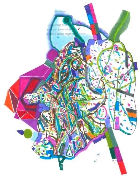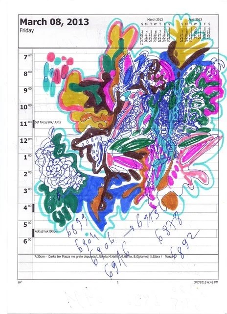 Parashikimi na doli, fatkeqësisht, i vërtetë: ja ku po e shikojmë në punimin e më poshtë se si ngjyrat po zmadhohen dhe ngadalë po i zaptojnë gjithë detyrat. Vështroje me kujdes se si ngjyra e stilolapsit që më përpara ishte përdorur për të shkruar detyrat e ditës, tani është brendësuar nga ngjyrat. Ndarja midis zbavitjes dhe detyrës po fillon të zhbëhet. Kundroje se si në cepin e sipërm majtas ngjyrat kanë mbuluar numrat 6916. A thua se do mbijetojnë gjatë? Po ato pika ngjyrash në orën 7 të mëngjesit? A thua të jetë një emoxhi apo status mbresëlënës fejsbuku? Apo ndonjë artikull për turizmin elitar?