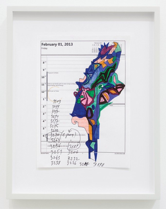 Parashikimi na doli, fatkeqësisht, i vërtetë: ja ku po e shikojmë në punimin e më poshtë se si ngjyrat po zmadhohen dhe ngadalë po i zaptojnë gjithë detyrat. Vështroje me kujdes se si ngjyra e stilolapsit që më përpara ishte përdorur për të shkruar detyrat e ditës, tani është brendësuar  nga ngjyrat. Ndarja midis zbavitjes dhe detyrës po fillon të zhbëhet. Kundroje se si në cepin e sipërm majtas ngjyrat kanë mbuluar numrat 6916. A thua se do mbijetojnë gjatë? Po ato pika ngjyrash në orën 7 të mëngjesit? A thua të jetë një emoxhi apo status mbresëlënës fejsbuku? Apo ndonjë artikull për turizmin elitar?