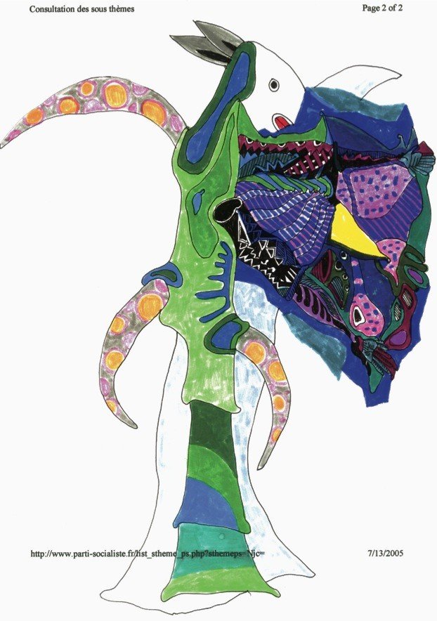 Këtu shohim kalendarin e lodhshëm të ditës, me takime të njëpasnjëshme, me numërime të shumta që ecin nëpër oraret. Duket që e gjithë dita është e ndarë në viza të ftohta, në orë pune dhe përkushtimi. Të gjitha këto shfaqin fushën e detyrës së lodhshme politike, të politikës si një shërbim dhe flijim për tjetrin. Por, siç shohim qartësisht kjo fushë e detyrës është pak nga pak duke u pushtuar nga ca ngjyra të çuditshme. Këto ngjyra janë fusha e mbulimit zbavitës: ajo është në kundërshti të plotë me rregullat, përllogaritjet dhe punët e ditës.  Në cepin e sipërm djathtas shohim edhe një parashikim: ngjyrat kanë mbuluar plotësisht ditët e ardhshme. Kjo është ardhmja që po na pretë. Mbulimi i detyrës me zbavitjen e pakuptimtë të bojës, me gajasje nëpër emisione ku fliten për njerëz të vdekur, me jargavitje në parlamentin e vjedhjes, apo një përcjellje me shaka e të rinjve që po e braktisin këtë vend gjerësisht. Politikanët gjithkund, jo vetëm në Shqipëri, po shndërrohen ngadalë në karaktere qesharake brenda një komedie të errët, ku çdo gjë përligjet nëpërmjet një shakaje.