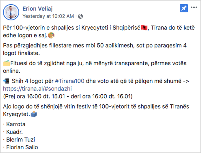 “Fituesi do të zgjidhet nga ju, në mënyrë transparente, përmes votës online,” thotë kryebashkiaku i Tiranës, Veliaj, në statusin ku ka shpallur konkursin e logove të 100-vjetorit kryeqytet.