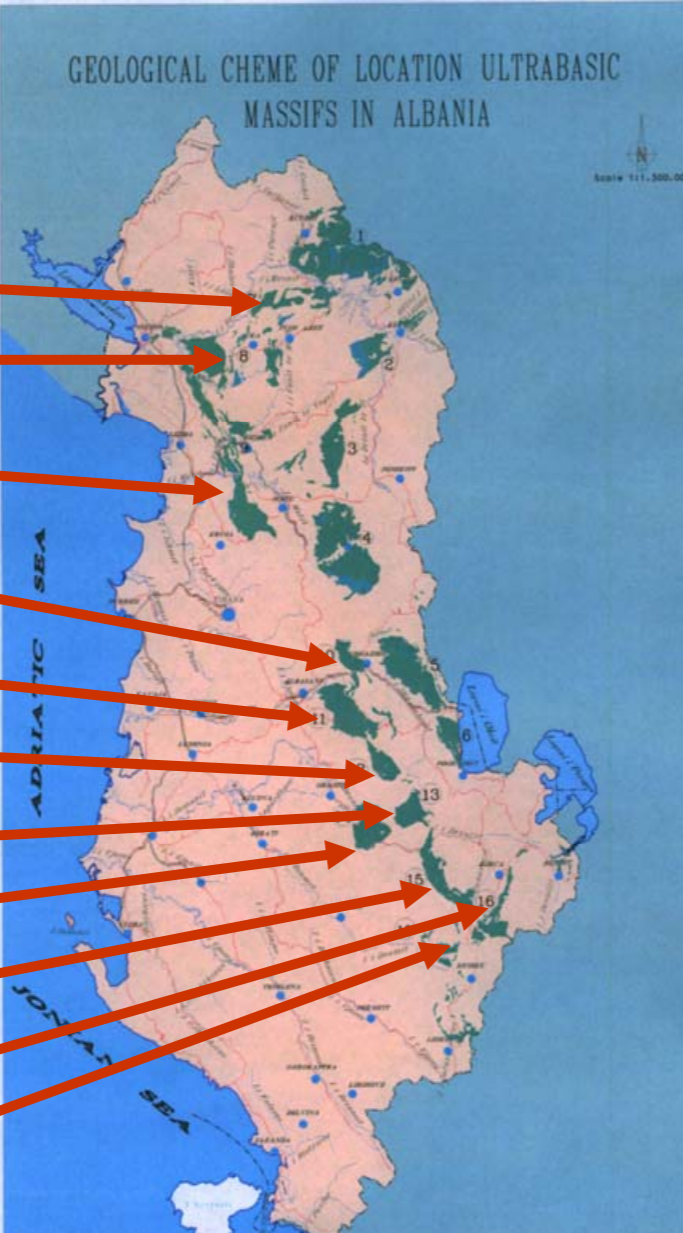 Shpërndarja e burimeve të kromit në Shqipëri. Burimi: METE 2011.