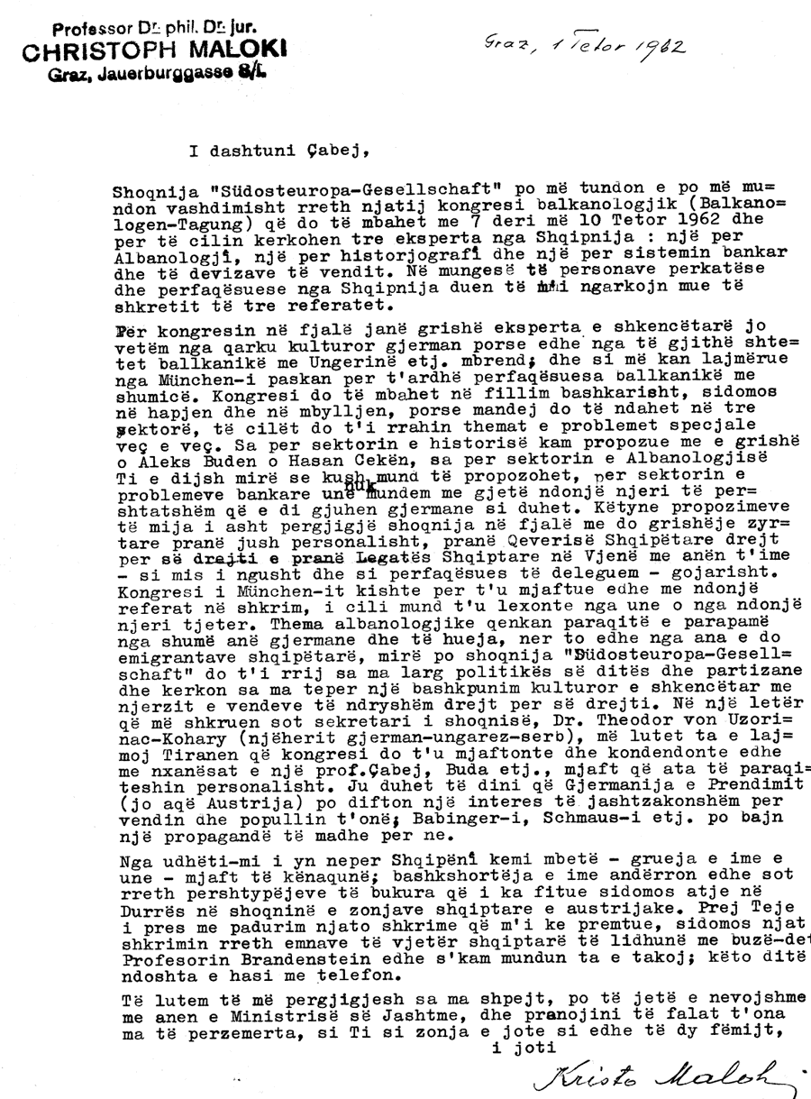 Maloki njihte dhe admironte punën, cilësinë dhe nivelin e lartë shkencor të Çabejt. Rrethanat e veçanta të Luftës së Ftohtë vështirësonin së tepërmi veprimtarinë shkencore dhe shkëmbimet përkatëse. Një Konferencë Balkanologjike [Balkanologen Tagung] do të mbahej në Mynih të Gjermanisë Perëndimore në tetor 1962. Aty do të ftoheshin edhe tre shkencëtarë nga Shqipëria, dhe kjo i ishte lënë në dorë Malokit. I ndërgjegjshëm për rëndësinë e aktivitetit, për vështirësitë e komunikimit me Tiranën, dhe për problematikën shtesë të lidhur me atmosferën e Luftës së Ftohtë, si dhe për domosdoshmërinë e pjesëmarrjes së studiuesve shqiptarë të nivelit më të lartë në fushat e tyre, Maloki i shkruan Çabejt në tetor 1962: