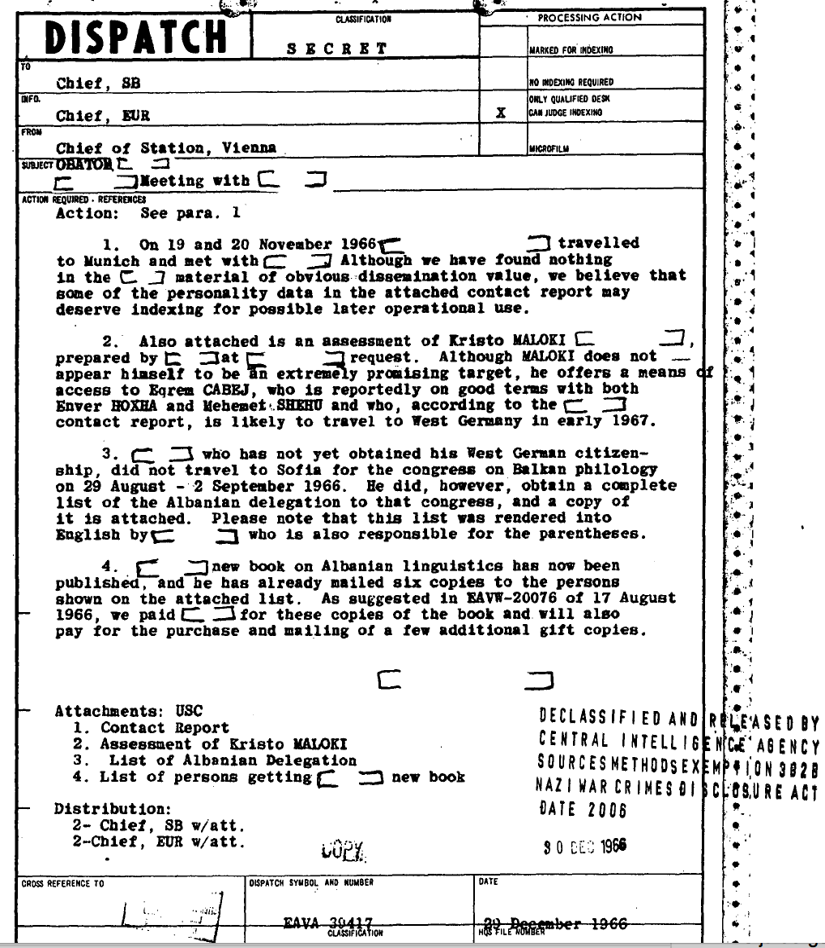 Nga pikëpamja e CIA-s, të dhënat e imta të marra nga informatori i tyre në takimin e Mynihut nuk kishin ndonjë vlerë të veçantë. “Edhe pse në materialin e [Prof. Z.-ës][54] nuk kemi gjetur asgjë me vlerë të qartë shpërndarëse [dissemination value], besojmë se disa nga të dhënat biografike [personality data] në raportin e bashkëngjitur të kontakteve mund të meritojnë indeksime për përdorime të mundshme të mëvonshme operacionale” [possible later operational use], i raportonte qendrës në Dispatch-in e tij Shefi i Stacionit të CIA-s në Vjenë.[55]