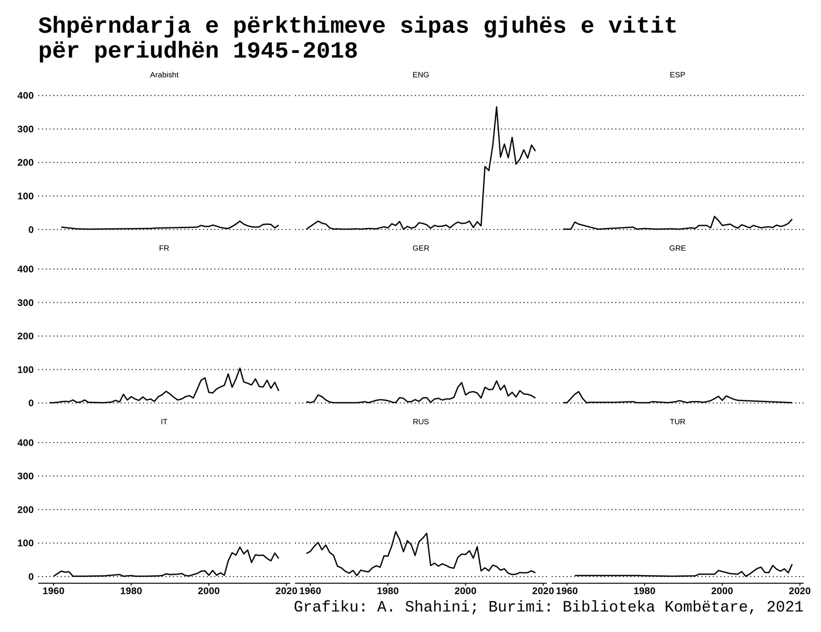 Në dy grafikët e parë janë gjuhët kryesore më të përkthyera në Shqipëri. Grafiku i tretë tregon 10 gjuhët më të përkthyera në botë.