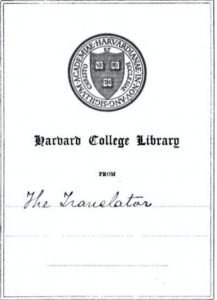 Etiketa EX LIBRIS, e vendosur në anën e brendshme të kapakut nga personeli i bibliotekës, paraqet stemën e universitetit si dhe faktin se vepra është dhurim i përkthyesit.