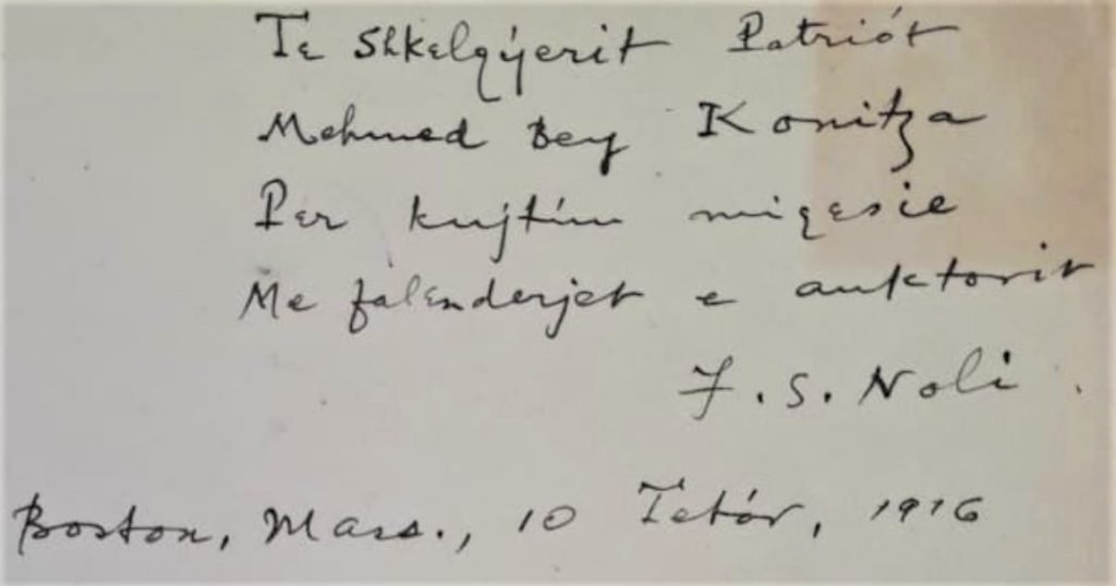 Përkushtimi sipëror “për kujtím miqësie” i Nolit ndaj Mehmet Konicës, “të Shkëlqyerit Patriót” përmban edhe vendin dhe datën e saktë të dhurimit.