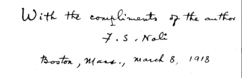 Nuk shohim aty frazën “alumn, class of 1912” [ish student i universitetit, diplomuar në v. 1912]. Vallë a do të ketë vajtur personalisht Noli për ta dhuruar dorazi librin në bibliotekën e universitetit të tij, e cila ishte vetëm 25 minuta larg me metró nga shtëpia ku jetonte në Boston?