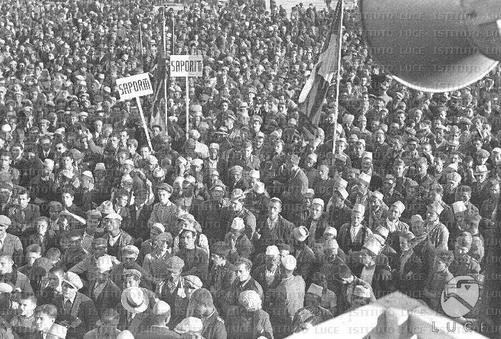 Figura 1. Qytetarë të Tiranës përpara Bashkisë së vjetër dëgjojnë fjalimin e Duçes, gjatë të cilit ai do t’i shpallë luftë Anglisë. 10 qershor 1940, (Instituti Luce)