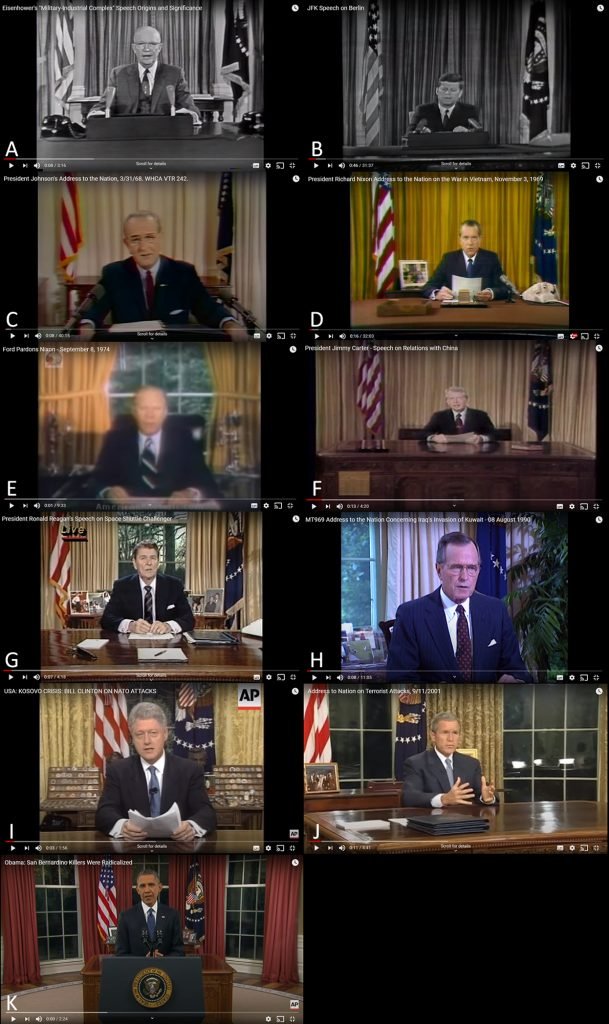 Figura 2. Nga e majta në të djathtë dhe nga lart poshtë, paraqiten presidentët amerikanë, a: Eisenhower; b: Kennedy; c: Johnson; d: Nickson; e: Ford; f: Carter; g: Reagan; h: Bush; i: Clinton; j: Bush Jr; k: Obama duke mbajtur fjalimet e tyre në zyrën vezake. (youtube)