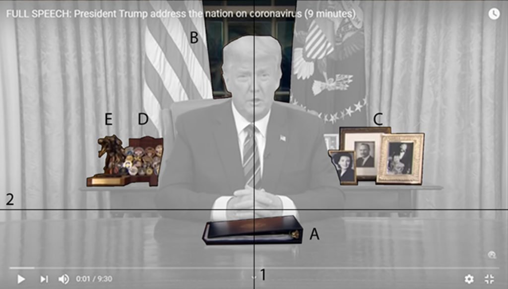 Presidenti Amerikan qëndron përballë nesh i ulur në tavolinën e tij të punës, në zyrën vezake (oval). Vendndodhja mjafton për të kuptuar rëndësinë e mesazhit, pasi kjo tryezë me në sfond murin e harkuar të zyrës presidenciale është pozicioni më i shpeshtë prej ku presidentët kanë ndarë me amerikanët dhe botën lajme dhe vendime vërtetë të rëndësishme (fig.2). Këtu Eisenhower mbante fjalimin e lamtumirës, Kennedy fliste për krizën e murit të Berlinit, Lyndon Johnson e Richard Nixon për zhvillimet e luftës së Vietnamit. Po nga kjo zyrë, dhe ky sfond Gerald Ford do ta falte Nixonin pas skandalit Watergate. Në vazhdim Carter, nga kjo hapësirë, do të informonte për krizën e pengjeve në Iran, Reagan për aksidentin e anijes kozmike Challenger, George Bush për luftën në Irak, Clinton për Kosovën dhe bombardimin e Jugosllavisë, George Bush Jr për sulmet e 11 shtatorit dhe Barak Obama për masakrën e San Bernardinos. Donald Trump vazhdon sipas traditës së paraardhësve, skena dhe skenari janë të ngjashëm, ndërsa veçantitë e mesazhit të tij do të na duhet t’i kërkojmë nëpër detaje.