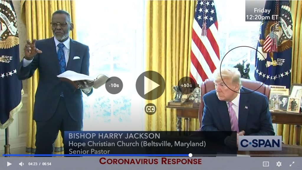 | Figure 8. Pastori Harry Jackson duke mbajtur lutjen e pashkës drejtpërdrejt nga zyra vezake. Me rreth është shënuar statuja e ish-presidentit Jackson që mungonte ditën e fjalimit për krizën koronavirus (c-span) |