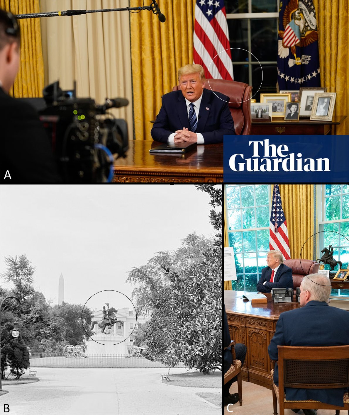 | Figura 6. Statuja mbi kalë e presidentit Jackson. A: Foto e bërë gjatë fjalimit për masat kundër koronavirusit. Pas tij mungon modeli i zvogëluar i statujës së Jackson (The Guardian); b: Memoriali i Jackson-it i fotografuar mes 1900-1910-ës, në parkun Lafayette (Libraria e Kongresit); c: Foto e shkrepur gjatë një takimi në zyrën vezake, më 29 gusht 2019, ku duket modeli pas shpatullave të presidentit (Foto zyrtare e Shtëpisë së bardhë nga Shealah Craighead) |