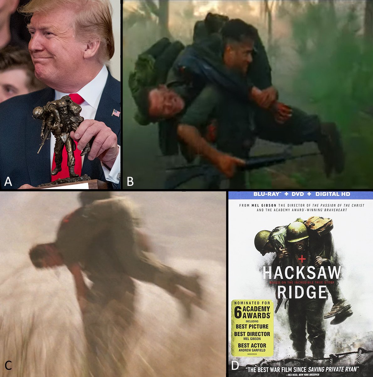 | Figure 7. Statuja e dy ushtarëve. A: Presidenti amerikan gjatë takimit të datës 18 prill 2019 kur ju dorëzua statuja e vogël që e mban vazhdimisht mbi tavolinën pas shpinës (AP Photo/Andrew Harnik); B: Skenë nga komedia Forrest Gump (1994); C: Skenë nga filmi I Lindur me 4 Korrik 1989; D: Posteri i filmit Kreshta Hacksaw, 2016. |