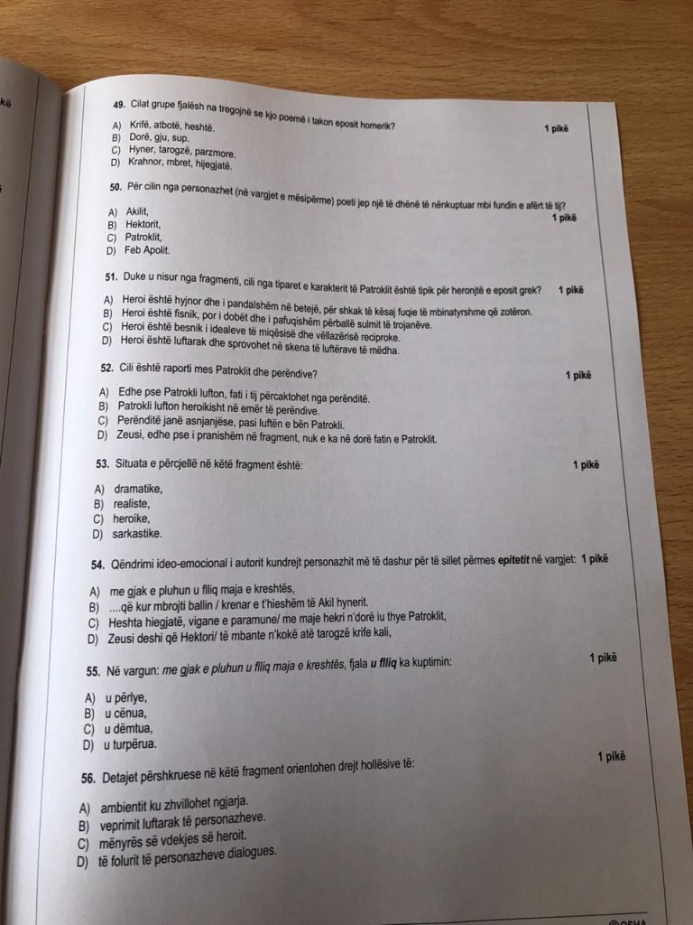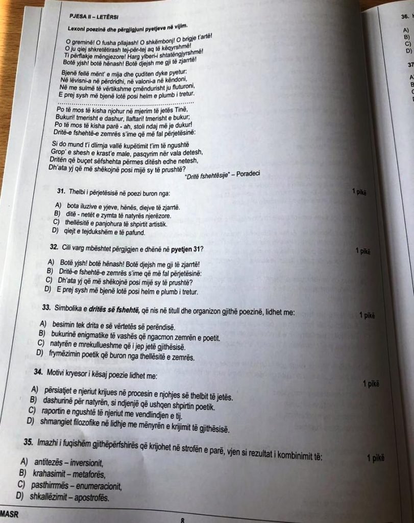 P.s. Unë vij nga një shkollë profesionale, kam studiuar muzikë para universitetit, dhe me këtë test nuk do të mund të hyja në universitet. Sepse sot shkollat profesionale në Shqipëri bëjnë vetëm 70% të programit të letërsisë për shkollat e mesme. Dhe për nxënësit e këtyre shkollave është përdorur po ky test. Po me këtë a ka diçka që nuk shkon?