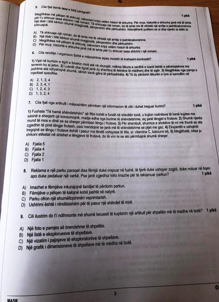 Pyetja 3. “Mësuesi ju ka dhënë për të shkruar një ese narrative në lidhje me një periudhë të jetës suaj, kur keni kapërcyer me sukses një vështirësi. Cila nga alternativat e mëposhtme është një hyrje e përshtatshme dhe efektive për një ese të tillë?” (fjalët e nënvizuara janë elemente parazite në një shqipe të përkorë).