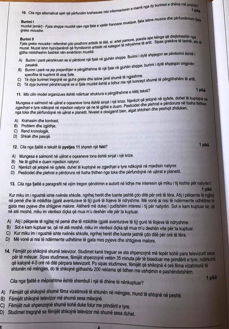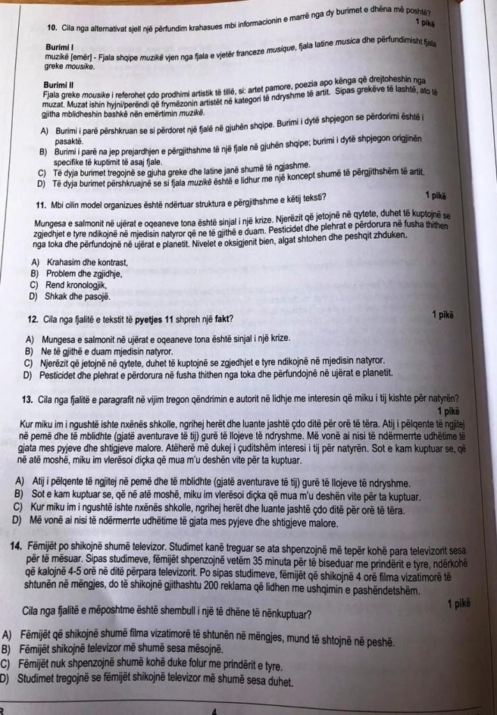 Edhe pyetja 11, 12 ka një paragraf të qartë dhe kërkesë të qartë. Vijoj me logjikën që nëse ka koncepte të qarta dhe vendimi është i sigurt. Edhe alternativat janë të qarta. Shqetësimi im në pyetjen 11 është lloji i tekstit që kanë zgjedhur për ilustrim. Këtu kemi një paragraf që trajton një temë të mprehtë globale dhe flitet për salmonin. Në ujërat tona, me sa di unë, nuk rritet salmon. Në testin e gjuhës, duke përjashtuar një paragraf nga Eqrem Çabej, nuk ka asnjë tekst që lidhet me shqiptarët dhe Shqipërinë (edhe kur flitet për Sarandën shkruan një e huaj). Nëse testi duhet të ketë patjetër një frymë të re dhe moderne, atëherë mund të përdoreshin fare mirë shkrimtarët e rinj, librat më të mirë të botuar këto kohë në shqip, publicistikën më të mirë. Nëse këto tekste nuk arrijnë te shkolla, ku duhet?