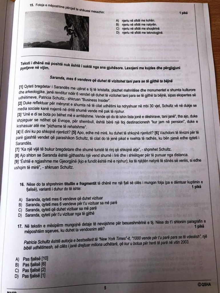 Pyetja 5 më duket e qartë. Është formuluar mirë dhe midis paragrafit që është dhënë si shembull dhe alternativave ka qartësi dhe lidhje të dukshme, dhe alternativa e saktë sipas meje është dukshëm e ndryshme nga të tjerat.