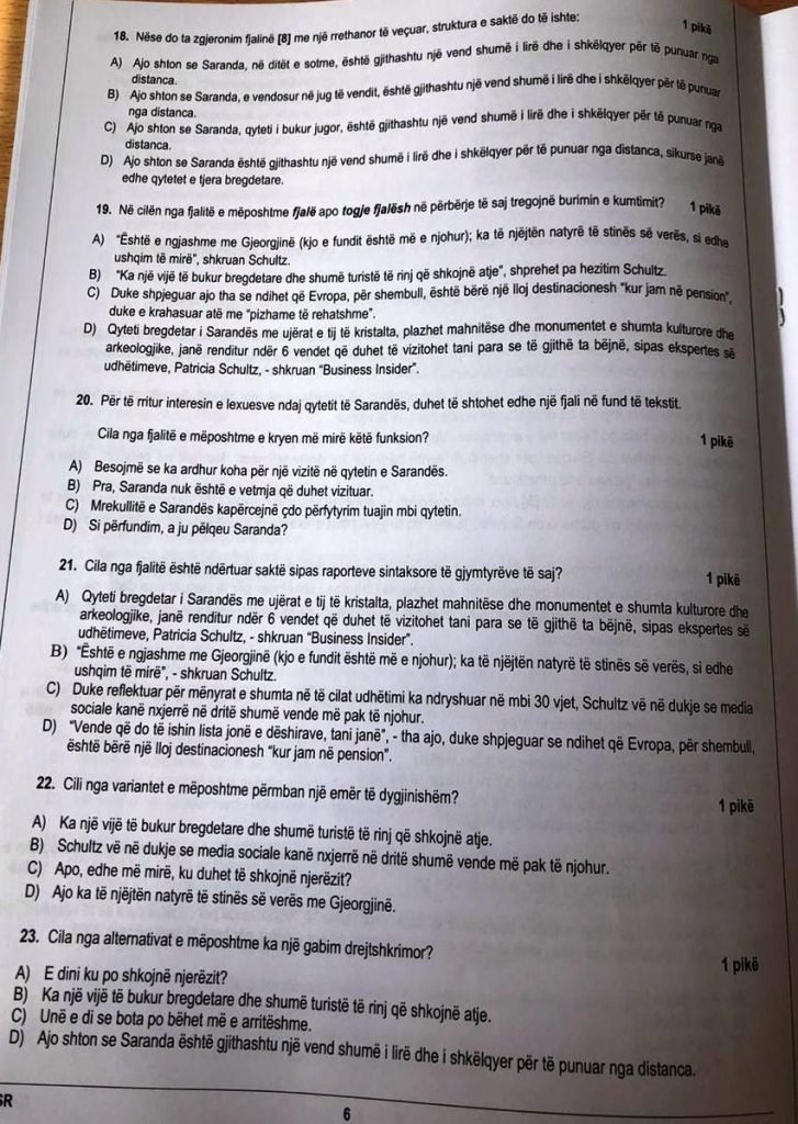 Shëmtitë e qëllimta të tekstit mbi qytetin më të bukur të Shqipërisë duhet t’i lexosh më shumë se një herë, se janë shembuj në disa ushtrime, dhe çudia është pyetja 19 kur ti duhet t’i analizosh fjalitë me gabime dhe t’i konsiderosh për të drejta dhe pa gabime, që të gjesh përgjigjen e saktë. Kjo pyetje për mua është shembull i një mësimi etik për realitetin shqiptar: zbulo, po munde, gjënë e mirë mes moçalit të së keqes.