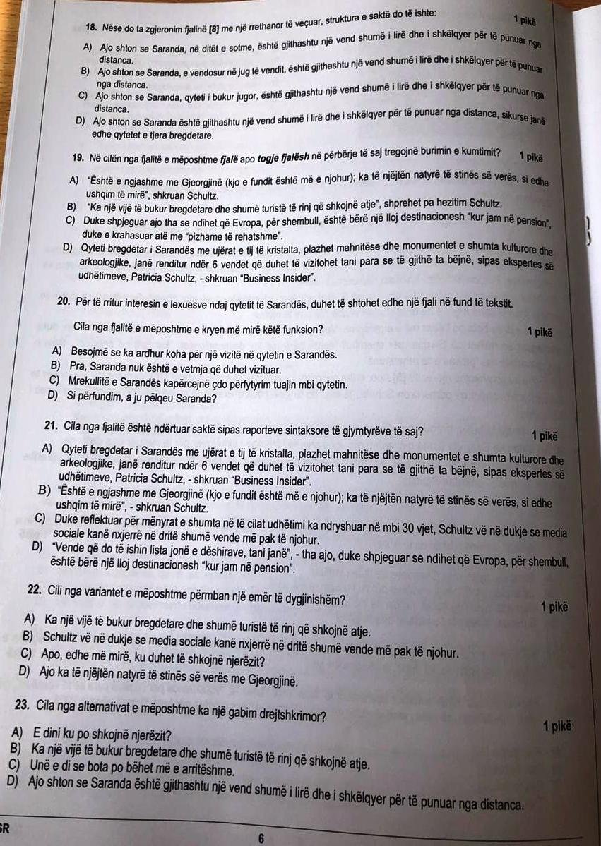 Pyetja 6 kërkon që nxënësi të rishkruajë në një fletë paragrafin me fjalitë sipas radhës që ai mendon. Më duket një pyetje e formuluar mirë, metodologjikisht e qartë, fjalitë duhet të renditen sipas një rendi logjik të përcaktuar. I vetmi problem në plotësimin e kësaj pyetjeje është se ajo kërkon një fletore tjetër ose fletë ku nxënësi të rishkruajë. Nëse nuk e kanë lënë nxënësin të shkruajë diku tjetër, realizimi me sukses i kësaj përgjigjeje është cenuar.