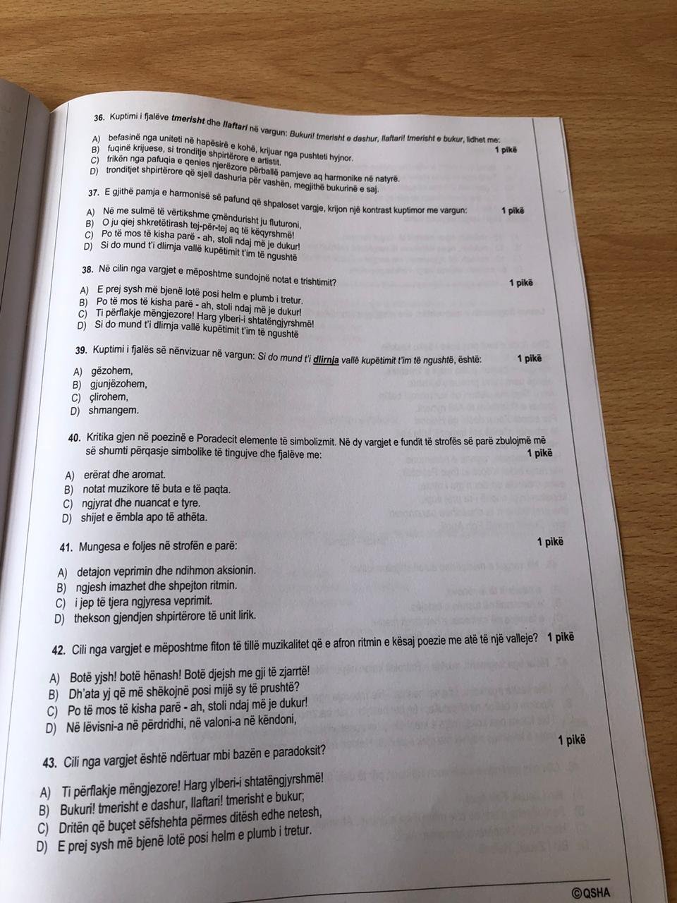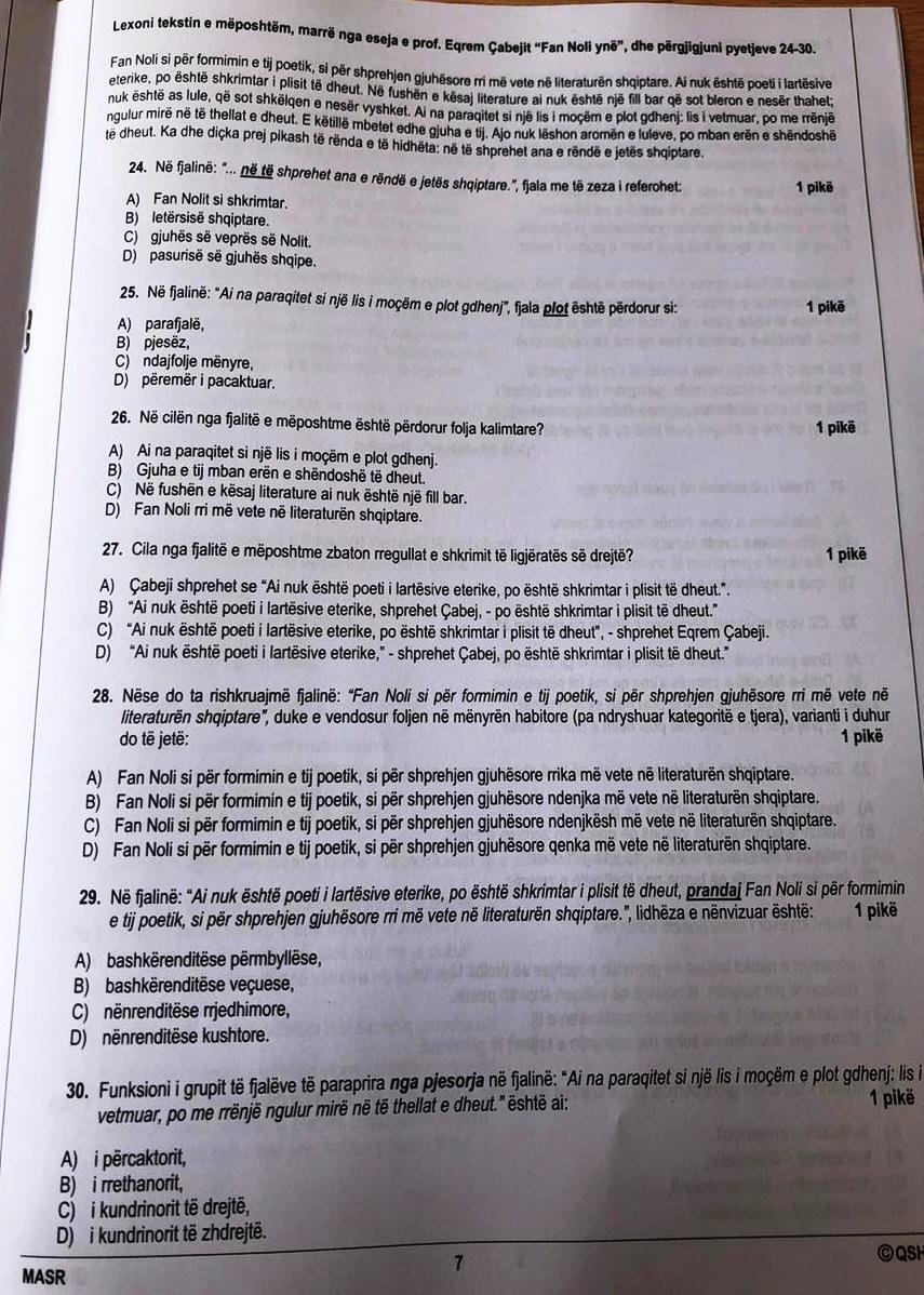Në këtë shkrim dua të jap mendimin tim për pjesën e parë të këtij testi, për pjesën e gjuhës shqipe, dhe dua të shpreh mendime si një njeri që e studion gjuhën, ligjëron për gjuhësinë, leksikologjinë dhe normën e standardit në universitet, ta vështroj këtë test edhe nga pikëpamja e aktorit universitar që pret të vijojë më tej formimin e nxënësve të diplomuar. Nuk e vë në dyshim dëshirën e ekipit të QSHA-së për të hartuar një produkt të mirë, dhe do të them në fund se ku mund të ketë çaluar puna. Do të përpiqem të jap mendimin tim për 30 pyetjet e testit të gjuhës shqipe, me qëllim që ky dokument nesër të mund të shërbejë për të përmirësuar diçka në këtë proces, dhe jo “për ta derdhur të gjithë kovën” e asaj që është arritur në këtë punë gjithë këto vite, por edhe këtë herë.