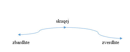 -Në grupin e tretë janë ngjyrat: zbardhte, skuqej, zverdhte. Nëse do të përpiqeshim që të paraqesnim në formë grafike kuptimin e foljeve, ku boshti numerik të tregonte horizontalisht kuptimin sipas procesit natyror, dhe ai vertikali kuptimin sipas pragmatikës, atëherë do të